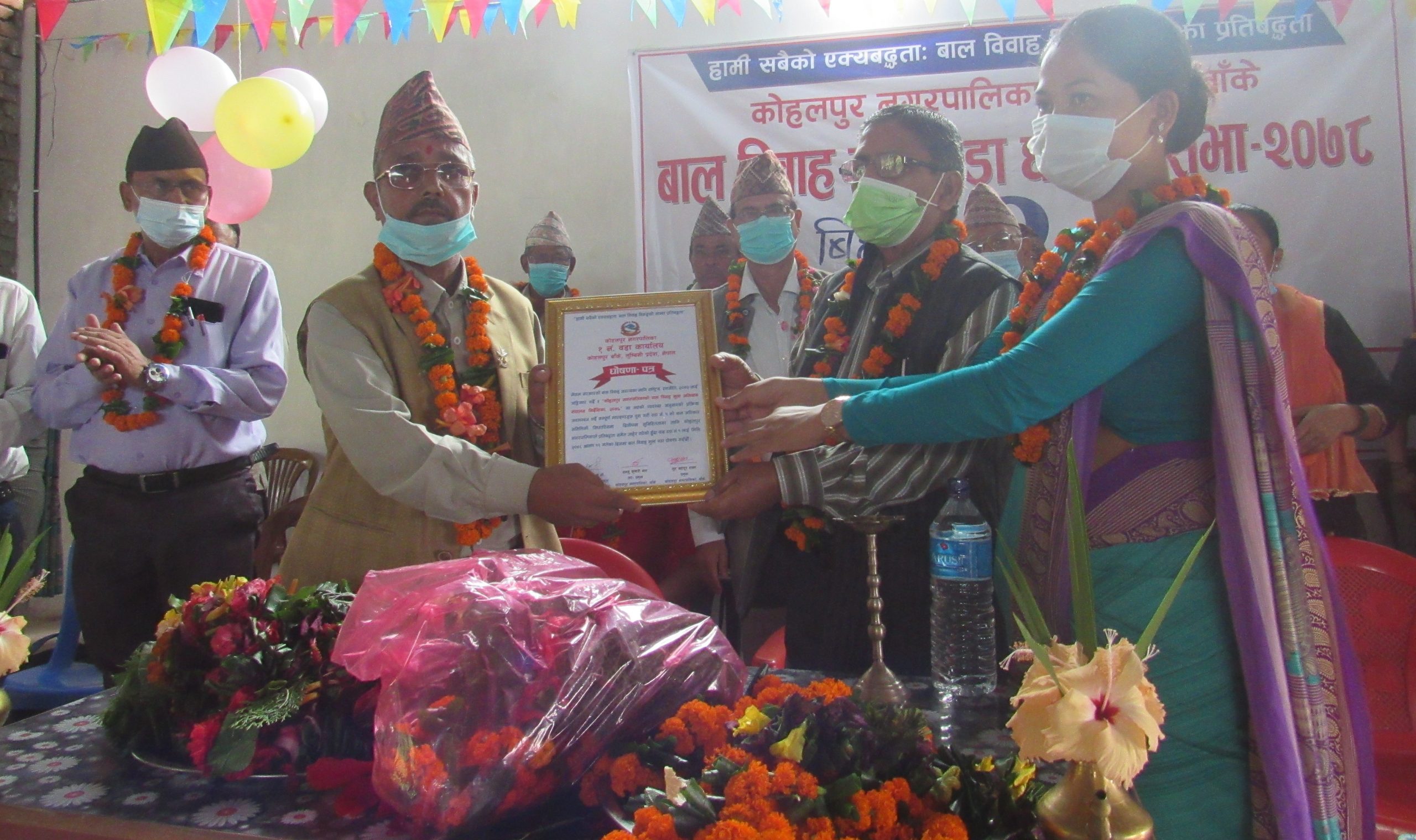 बाँकेको कोहलपुर नगरपालिका वडा नं. १ लाई बाल विवाह मुक्त घोषणा गरिएको छ । कोहलपुर नगरपालिकाका नगरप्रमुख लुट बहादुर रावत र उपप्रमुख सञ्जु कुमारी चौधरीले वडा नं. १ लाई बालविवाह मुक्त वडाका रुपमा घोषणा गरेका हुन् । कार्यक्रममा बोल्दै कोहलपुर नगरपालिकाका नगरप्रमुख लुट बहादुर रावतले राज्यले बालविवाह रोक्नकालागि थुप्रै कानून, विभिन्न नीति नियम, निर्देशिका, कार्यविधिहरु निर्माण गरिरहेकोले सो नीतिनियमको पालना गर्न किशोर किशोरी सचेत हुनुपर्ने बताएका छन् । साथै उनले बालविवाह कानूनले बन्देज गरेको छ भन्ने कुराको थाहा हुँदा हुँदै पनि पुर्खाहरुले सात वर्षकी कन्यालाई विवाह गरे पुण्य मिल्छ भन्दै स्थापना गरेको कुरीतीले नै बालविवाह हुने गरेको बताएका छन् । साथै उनले नेपाली समाजको विकास र सचेतना विकास भएसँगै समाजका रहेक वर्ग शिक्षित भईरहेको बताउँदै कोहलपुर नगरपालिका विभिन्न संघसंस्थाहरुसँग सहकार्य गरी समाजका विभिन्न वर्गलाई सचेत गराईरहेको अवस्थामा बालबालिकाहरुलाई विवाह गर्न २० वर्ष पुरा हुनुपर्छ भन्ने चिन्तनको विकास गर्न लागिपरिएको बताएका छन् ।