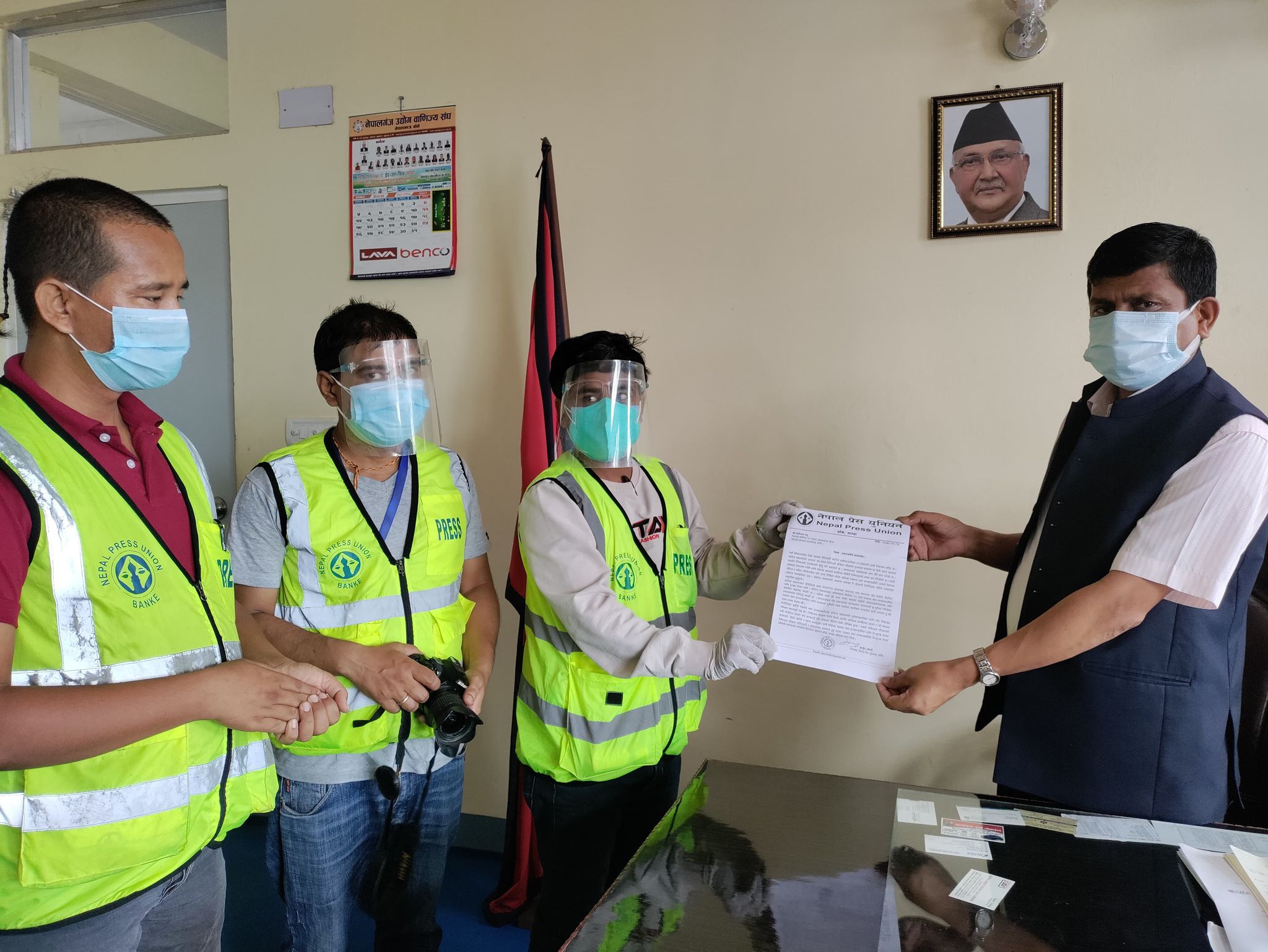 पत्रकार तथा सञ्चारकर्मीका लागि विभिन्न माग राख्दै नेपाल प्रेस युनियन बाँकेले बिहीबार ‘जिल्ला कोभिड–१९ संकट ब्यवस्थापन केन्द्र’ बाँकेलाई ध्यानाकर्षण पत्र बुझाएको छ । केन्द्रका संयोजक समेत रहेका बाँकेका प्रमुख जिल्ला अधिकारी शिवराम गेलाललाई युनियन बाँकेका अध्यक्ष अर्जुन ओलीले उक्त पत्र बुझाएका हुन् । प्रेस युनियनको ३१ औं स्थापना दिवसको सन्दर्भ पारेर बुझाइएको ध्यानाकर्षण पत्रमा पिसिआर परिक्षणको कामलाई छिटो, छरितो र सहज बनाउनुका साथै बाँकेका पत्रकार तथा सञ्चारकर्मीका लागि निःशुल्क रूपमा पिसिआर परिक्षण गरिदिनुपर्ने र कोरोनाबाट संक्रमित भएका पत्रकार तथा सञ्चारकर्मीको निःशुल्क रुपमा औषधी उपचारको ब्यवस्था मिलाउन माग गरिएको छ । ‘रिपोर्टिङमा खटिने पत्रकार तथा सञ्चारकर्मीलाई कोरोना संक्रमणको पुर्वसावधानीका लागि पनि पिसिआर परिक्षण महत्वपुर्ण पक्ष हो, पिसिआर परिक्षण रिपोर्ट ढिलो आउँदा ब्यक्तिमा अन्यौलता छाउने र त्यो बेलामा यदी पोजेटिभ भएको भए अन्यलाई पनि संक्रमण फैलिन सक्ने जोखिम हुन्छ,’ ध्यानाकर्षण पत्रमा उल्लेख छ । जटिल र कठिन परिस्थितीमा पनि उच्च जोखिम मोलेर बाँकेका पत्रकार तथा सञ्चारकर्मीले आफ्नो पेशागत दायित्व निभाईरहेका र कोरोना संक्रमणको अवस्था यथावत नै रहेकाले रिपोर्टिङमा खटिने पत्रकारहरु असुरक्षित रहेको युनियनले जनाएको छ । युनियनको ध्यानाकर्षण पत्रमा भनिएको छ, ‘नयाँ भेरियन्टसहित दोस्रो चरणमा फैलिएको कोरोना भाईरस(कोभिड–१९)महामारी अझै नियन्त्रण बाहिर रहेको र कोरोना महामारीको ‘हटस्पट’ का रुपमा चिनिएको बाँकेमा पहिलेको तुलनामा संक्रमण दर केही घट्दो अवस्था भएपनि दैनिकजसो संक्रमितको मृत्यु भने भइरहेको छ, अस्पतालमा संक्रमितको चाप थोरै मात्र घटेको छ, महामारी नियन्त्रण गर्नकै लागि जिल्ला प्रशासन कार्यालय बाँकेले निषेधाज्ञाको समय थप गरिरहेको छ ।’ फ्रन्टलाईनमा रहेर समाचारका माध्यमबाट जनतालाई सु–सुचित गरिरहेका पत्रकार तथा सञ्चारकर्मीका लागि सरकारले कुनैपनि राहत प्याकेज/कार्यक्रम नल्याउँदा अत्यन्त दुःखी एवम् स्तब्ध भएको प्रेस युनियनले जनाएको छ । कोरोना संक्रमणबाट बाँकेस्थित खबर नेपालगन्ज डटकमका सम्पादक तथा प्रकाशक रईस साईको केहीदिन अघि दुःखद निधन भएको, कोरोना संक्रमणबाट अहिलेसम्म बाँकेका २७ जना पत्रकार तथा सञ्चारकर्मीहरु संक्रमित भइसकेको र संक्रमित मध्ये धेरै जना निको भएपनि केहीले होमआइसोलेसनमा बसेर स्वास्थ्यलाभ गरिरहेको युनियनले जनाएको छ । पत्र बुझाईसकेपछि युनियनका अध्यक्ष ओलीले जिल्लाका समग्र पत्रकारको गुनासा र सुझाव अनुसार ध्यानाकर्षण पत्र बुझाइएको भन्दै प्रेस युनियनले उठाएका मागलाई सम्बोधन 