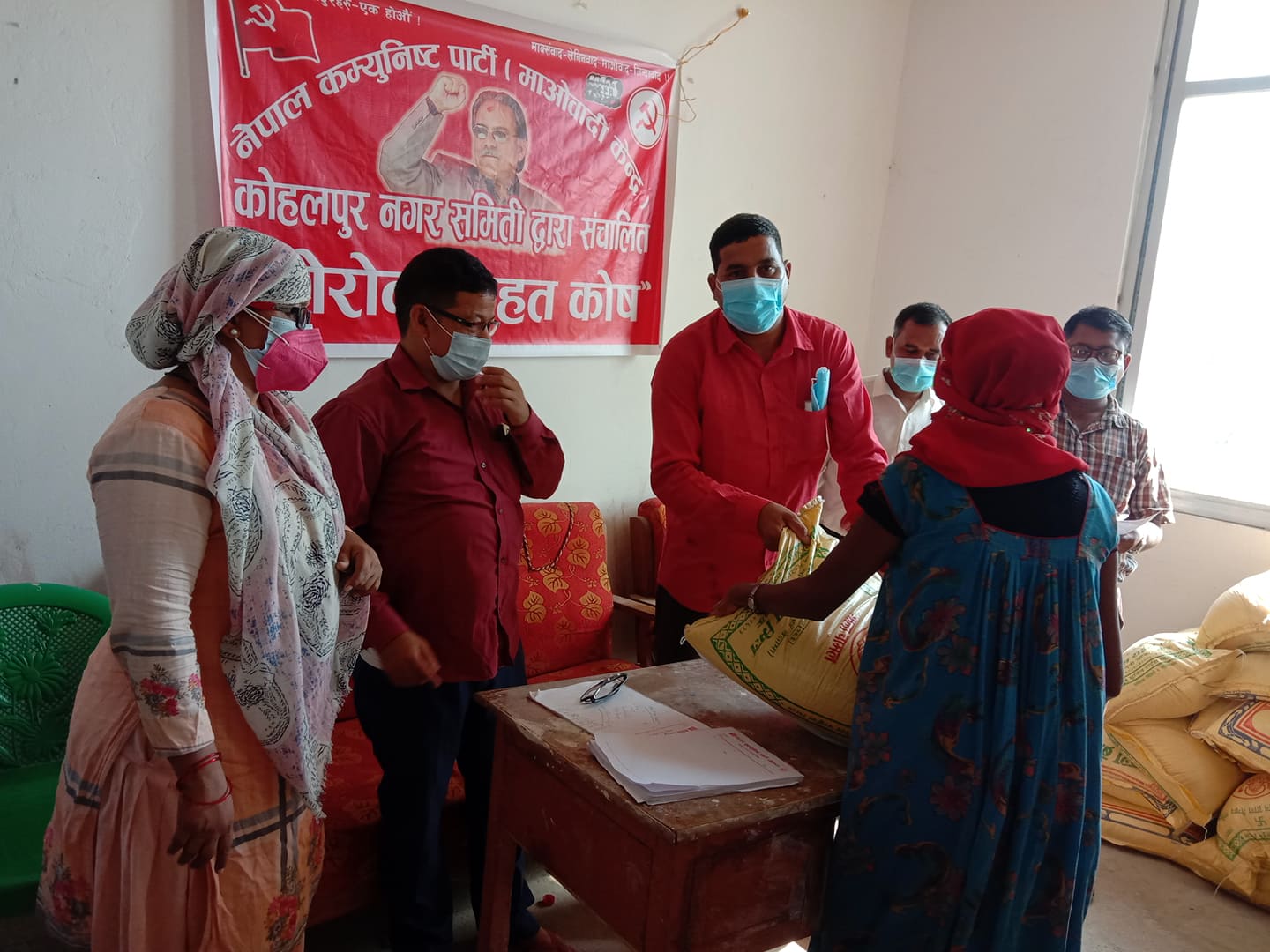 नेकपा माओवादी केन्द्रले बाँकेको कोहलपुर क्षेत्रभित्र रहेका अति विपन्न ५० घर परिवारलाई खाद्यान्न सहयोग गरेकोछ । माओवादी केन्द्र कोहलपुरले प्रति घर परविारलाई २५ किलो चामल सहयोग गरेको हो । कोरोना महामारीसँगै उत्पन्न परिस्थितीले समस्यामा परेका घरपरिवारलाई खाद्यन्न उपलब्ध गराएको हो । कोरोना भाईरसको महामारीमा माओवादी केन्द्रले जनतालाई विभिन्न क्षेत्रबाट सहयोग गरिरहेको जानकारी दिँदै यसअघि स्वास्थ्य सामग्री वितरण, निःशूल्क शव व्यवस्थापन तथा चिकित्सकसहित नगर क्षेत्रमा घरदैलो अभियान गर्दै आएको नेकपा माओवादी केन्द्रका नेता नरेन्द्र न्यौपानेले बताएका छन् । साथै उनले माओवादी केन्द्र कोहलपुर नगर कमिटिले कोरोनाका कारण लागु गरिएको बन्दाबन्दीबाट प्रत्यक्ष समस्यामा परेका घरपरिवारलाई खाद्यान्न वितरण गरिएको बताउँदै कोरोनाबाट ज्यान गुमाएका मृतकका परिवार, जनयुद्धका घाइते अपंगता भएका व्यक्ति तथा अति विपन्न अवस्थामा रहेका स्थानियहरुलाई दैनिक उपभोग्य खाद्य सामग्री उपलब्ध गराईने बताएका छन् । राहत वितरणकालागि पार्टीले कोरोना रहात कोष स्थापना गरी राहत संकलन सुरु गरेको न्यौपानेले बताए । त्यसैगरी नरेन्द्र न्यौपानेको नेतृत्वमा नेपालगन्ज मेडिकल कलेज शिक्षण अस्पताल कोहलपुरका चिकित्सक देबेन्द्र आचार्य सहितको टोलीले नगरभित्रका हरेक वडामा पुगी कोरोना संक्रमित बिरामीहरुको प्रत्यक्ष निगरानीका साथै आवश्यक परामर्शसहितको सेवा उपलब्ध गराउँदै आएको नेकपा माओवादी केन्द्र कोहलपुर नगर कमिटिले जनाएको छ ।
