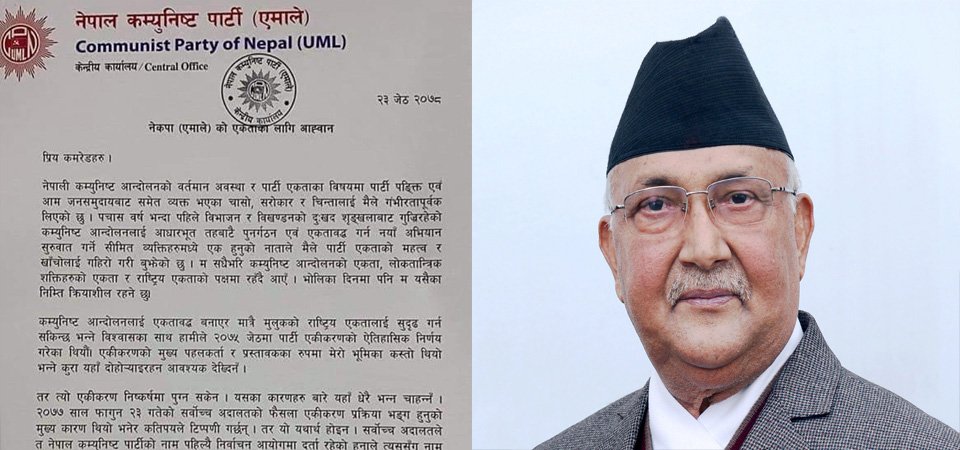 प्रधानमन्त्री तथा नेकपा (एमाले) का अध्यक्ष केपी शर्मा ओलीले पार्टी बलियो भयो भनेमात्र देशको लोकतन्त्र सुदुढ र राष्ट्र एकतावद्ध हुनसक्ने भन्नुहुँदै एकताका लागि पुनः आव्हान गर्नुभएको छ । उहाँले एक अपिल जरी गरी पार्टीलाई २०७५ साल जेठ ३ गते पूर्वको अवस्थाबाट अगाडि बढाइने प्रतिवद्धता पनि व्यक्त गर्नुभएको छ । नेता माधवकुमार नेपाल तथा झलनाथ खनाल पक्षले पार्टी एकता अब सम्भव नरहेको अभिव्यक्ति दिइरनुभएका बेला अध्यक्ष ओलीले आइतबार अपरान्ह पार्टीको नाममा एकता आव्हान गर्नुभएको हो । उहाँले आफू सदैव पार्टी एकताको पक्षमा रहेको दोहो¥याउनुभएको छ । “नेकपा (एमाले) को निर्माण र विकासमा हजारौं योद्धाहरुको पसिना, त्याग र बलिदान अन्तरनिहित छ, यस पार्टीप्रति जनताको अपार विश्वास छ” प्रधानमन्त्री ओलीले भन्नुभएको छ, “एमालेलाई सुदृढ गरेर मात्रै कम्युनिष्ट आन्दोलनलाई बलियो र एकतावद्ध बनाउन सकिन्छ ।” प्रधानमन्त्री ओलीले आव्हान पत्रमा भन्नुभएको छ, “म सधैंभरी कम्युनिष्ट आन्दोलनको एकता, लोकतान्त्रिक शक्तिहरुको एकता र राष्ट्रिय एकताको पक्षमा रहँदै आएँ । भोलिका दिनमा पनि म यसैका निम्ति क्रियाशील रहने छँु ।” कम्युनिष्ट आन्दोलनलाई एकतावद्ध बनाएर मात्रै मुलुकको राष्ट्रिय एकतालाई सुदृढ गर्न सकिन्छ भन्ने भन्ने विश्वासका साथ २०७५ जेठमा पार्टी एकीकरण गरिएको उहाँले स्मरण गर्नुभएको छ । पार्टी एकताका लागि आफू २०७५ जेठ ३ अघि पार्टीको गतिविधिमा फर्काउन तयार रहेको अध्यक्ष ओलीले आव्हान पत्रमा उल्लेख गर्नुभएको छ । साथै यसबीचमा भएका कमजोरी र गल्तीमा कुनै कारवाही नगरिने प्रतिवद्धता पनि व्यक्त गर्नुभएको छ ।