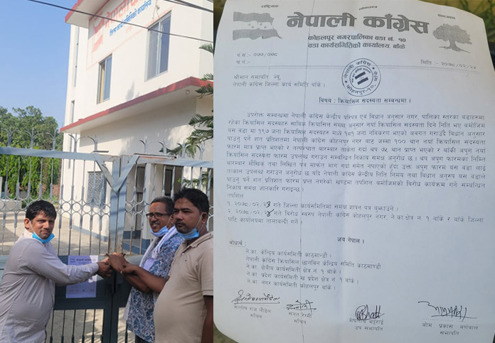नेपाली काँग्रेस कोहलपुर नगरपालिका वडा नं. १० को वडा कार्य समितिले शतप्रतिशत क्रियाशिल सदस्यता पाउनुपर्ने माग राख्दै नेपाली काँग्रेस पार्टी कार्यालय बाँकेमा तालाबन्दी गरेको छ । कोहलपुर नगरपालिका वडा नं. १०का वडा सभापति ओम प्रकाश वर्णवाल, उपसभापति मेघनाथ भट्टराई, सचिव सन्तोष पौडेल र सचिव सनत रेग्मीले पार्टीको क्रियाशिल सदस्यता वितरण गर्दा वडा नं. १०मा पाउनुपर्ने क्रियाशिल सदस्यता नपाईएको बताउँदै शतप्रतिशत क्रियाशिल सदस्यता पाउनुपर्ने माग गर्दै पार्टी कार्यालयमा तालाबन्दी गरिएको वडा सभापति ओम प्रकाश वर्णवालले बताएका छन् । कोहलपुर नगरपालिका वडा नं. १० मा हाल १ सय ९७ जनामध्ये १ सय ८१ जनाको क्रियाशिल नविकरण भएकाले क्रियाशलि सदस्यता शतप्रतिशत पाउनुपर्ने माग सहित पार्टी कार्यालय बाँकेमा तालाबन्दी गरिएको सचिव सन्तोष पौडेलले बताएका छन् । त्यस्तै कोहलपुर नगरपालिका वडा नं. २ नेपाली कांग्रेस कार्यसमितिले विधि पद्धति विपरित २०७४ को स्थानीय, प्रदेश र संघीय निर्वाचनमा नेपाली कांग्रेसका उम्मेद्वारलाई हराउन लागेका, माओवादी, एमाले र राप्रपा का कार्यकर्ता र बाहिरी जिल्लामा मतदाता नामावली भएका व्यक्तिहरुलाई कृयासिल दिने तर योग्य सक्षम र निरन्तर पार्टिमा योगदान गरेका कार्यकर्ताहरुलाइ क्रियाशिल सदस्यताबाट बन्चित गरिएको भन्दै पाटीए कार्यालयमा तालाबन्दी गरिएको बताईएको छ । पार्टीका लागि लडिरहेका कार्यकर्ताहरुलाई क्रियाशिल सदस्यता नदिएकोले तालाबन्दी गरिएको नेविसंघका आमन्त्रीत केन्द्रीय सदस्य कमल शाहीले बताएका छन् ।