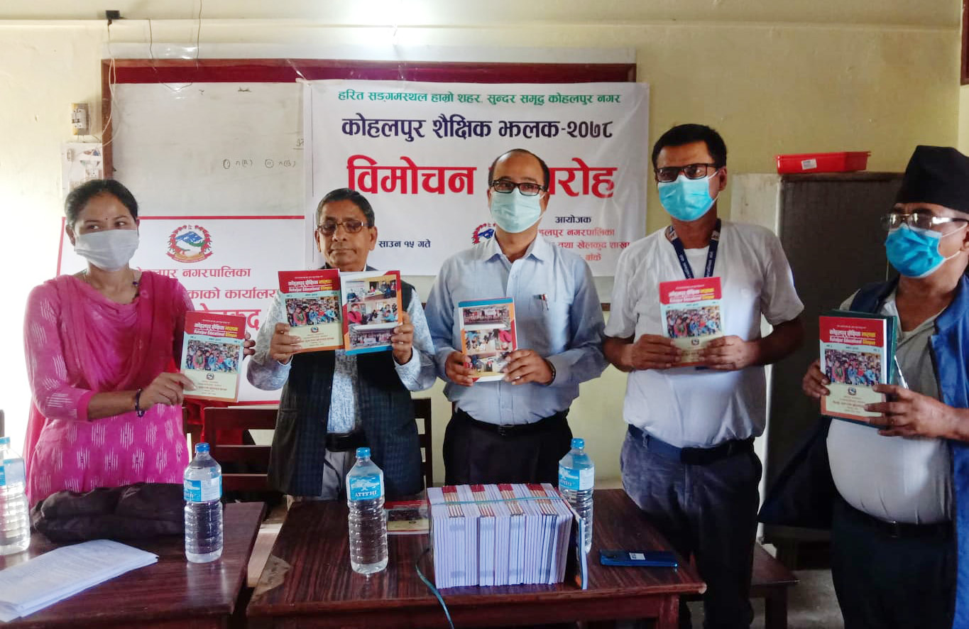 बाँकेको कोहलपुर नगर शिक्षा शाखाले शैक्षिक झलक २०७८ बिमोचन गरेको छ । “हरित संगमस्थल हाम्रो शहर, सुन्दर समृद्ध कोहलपुर नगर” भन्ने नाराका साथ कोहलपुर नगरपालिका भित्रका सम्पूर्ण शैक्षिक तथ्याङ्क, शैक्षिक गतिविधि, शैक्षिक अवस्थालाई उल्लेख गरि कोहलपुर शैक्षिक झलक २०७८ अंक दुई बिमोचन गरिएको छ । कोहलपुर शैक्षिक झलक कोहलपुर नगरपालिकाका नगरप्रमुख लुट बहादुर रावत, उपप्रमख सञ्जु कुमारी चौधरी लगायतले संयुक्त रुपमा बिमोचन गरेका हुन् । कार्यक्रममा बोल्दै कोहलपुर नगरपालिकाका नगरप्रमुख लुट बहादुर रावतले कोरोनाका कारण विद्यालयहरु लामो समय सम्म बन्द रहेको भन्दै विद्यार्थीको भौतिक उपस्थितिमा विद्यालय संचालन गर्नेन अवस्था नभएको बताएका छन् । साथै उनले विद्यार्थीहरुलाई कोरोना महामारीबाट पहिला बचाउनुपर्ने र शिक्षा भविष्यमा पनि आर्जन गर्न सक्ने भन्दै नियम विपरित विद्यालय संचालन गरेको खण्डमा कारवाही गरिने चेतवानी दिएका छन् । साथै उनले कोहलपुरलाई शैक्षिक हबका रुपमा विकास गर्नका लागि एक विद्यालय एक प्राविधिक धार पढाइको अवधारण लिईएको बताउँदै सबै विद्यालयहरुले साथ दिनुपर्ने बताएका छन् ।