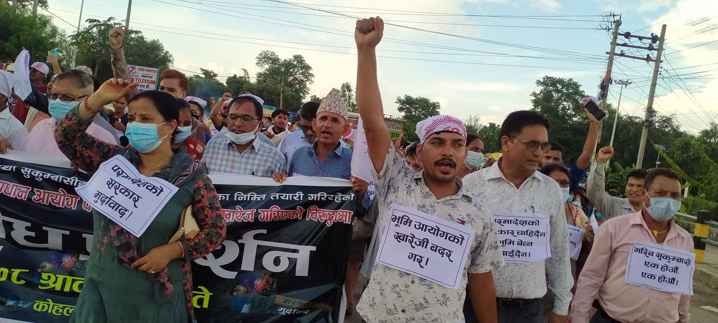 नेकपा एमालेले भूमीसम्बन्धी समस्या समाधान आयोग विघटन गर्ने सरकारको निर्णयविरुद्ध आईतबार कोहलपुरमा विरोध प्रर्दशन गरेको छ । नेपाली काँग्रेसका सभापटि शेर बहादुर देउवा नेतृत्वको गठबन्धन सरकारले भूमि सम्बन्धी समस्या समाधान आयोग विघटन गर्ने निर्णयका विरुद्ध नेकपा एमाले बाँके र एमालेका सबै जनवर्गिय संगठनहरुले कोहलपुरमा विरोध प्रर्दशन गरेका हुन् । विरोध सभामा बोल्दै नेकपा एमालेका नेता तथा संविधान सभा सदस्य देवराज भारले केपि शर्मा ओली नेतृत्वको सरकारले नेपालका लाखांैं भूमिहिन सुकुम्बासीहरुलाई जग्गा उपलब्ध गराउनका लागि काम गरिरहेको अवस्थमा देउवा सरकारले भूमि आयोग खारेज गरेर सुकुम्बासीलाई जग्गाको मालिक हुनबाट रोकेको बताएका छन् । कार्यक्रममा बोल्दै नेकपा एमाले बाँकेका जिल्ला अध्यक्ष सूर्य ढकालले भूमि सम्बन्धी समस्या समाधान आयोगले देश भरीका भूमिहिनहरुको लगत संकलन गरी लालपूर्जा दिने अवस्थामा कतिपय ठाउँहरुमा काम भईरहेको अवस्थामा भूमि आयोग खारेज गरेर सरकारले राजनैतिक अपराध गरेको बताएका छन् । साथै उनले सरकारले तत्काल निर्णय सच्याएर आयोगलाई काम गर्ने वातावरण बनाउन माग गर्दै भूमिहिन दलित, भूमिहिन सुकुम्बासीले जग्गाको स्वामित्व नपाए एमालेले आन्दोलनका कार्यक्रमहरु ल्याउने बताएका छन् । कार्यक्रममा भूमि सम्बन्धी समस्या समाधान बाँके जिल्ला सदस्य गोपाल गिरीले भूमि आयोगले बाँके जिल्लाका स्थानिय तहहरुसँग सम्झौता गरी कामहरु अगाडि बढाईरहेको बेला आयोग खारेज गरेर सरकारले ठुलो गल्ति गरेको बताएका छन् । कार्यक्रममा एमाले निकट राष्ट्रिय यूवा संघका स्थायी कमिटि सदस्य खेमराज शर्माले सयौं वर्षदेखि जग्गा उपभोग गर्दै आएका जनतालाई जग्गाको मालिक केपि ओली नेतृत्वको सरकारले बनाउन लागेको देखेर देउवा सरकार आतिएको भन्दै जनतालाई जग्गाको मालिक बनाउन माग गरेका छन् । साथै सरकारले भूमि आयोग विघटन गरी जनताको सपना माथि अपराध गरेको भन्दै निर्णय तत्काल नसच्याए एमाले र यूवासंघ लगायतका जनवर्गिय संठनहरुले देशभरी आन्दोलन गर्ने चेतवानी समेत दिएका छन् । सो कार्यक्रममा एमाले निकट नेता तथा कार्यकर्ता लगायत भूमिहिन सुकुम्बासीहरुको सहभागिता रहेको थियो ।