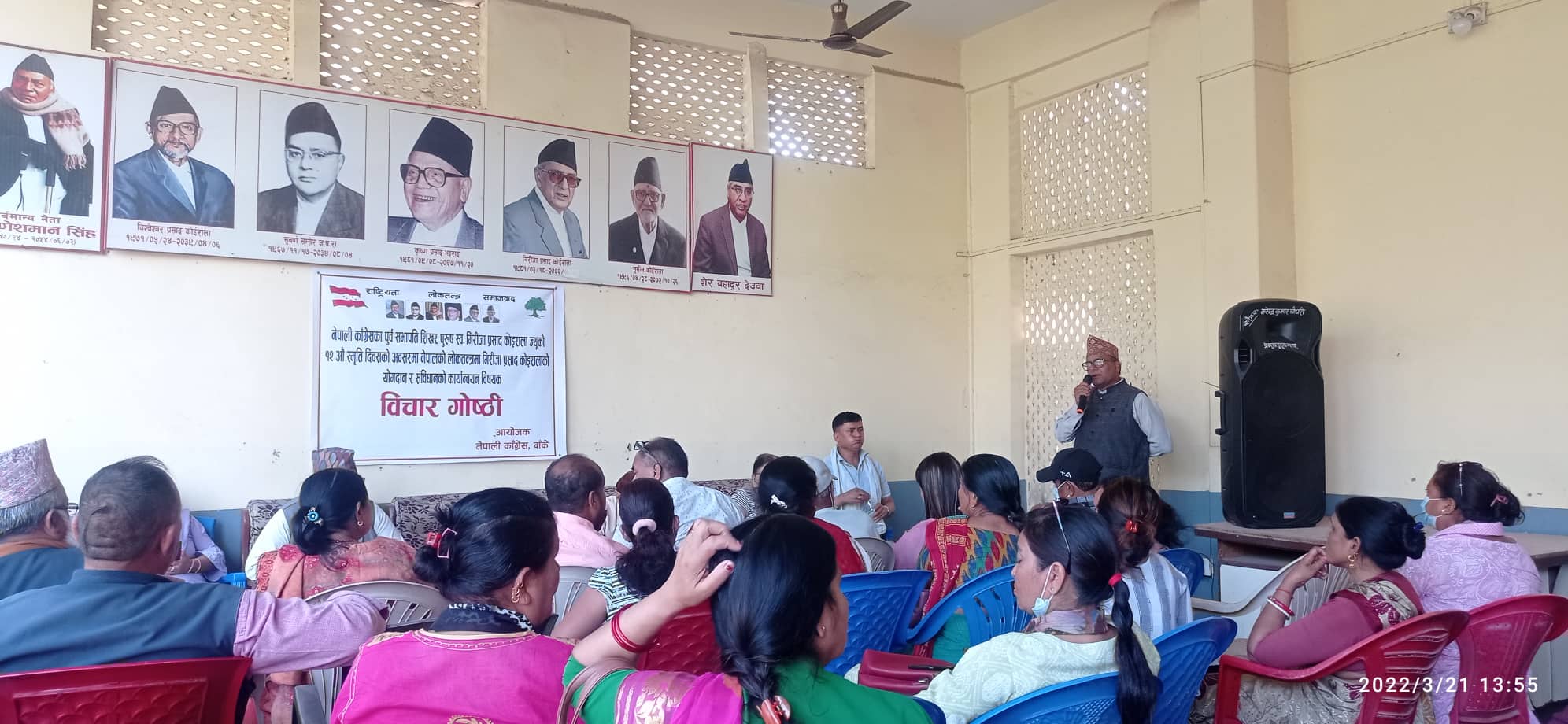 विचारगोष्ठीमा प्रमुख अतिथि शर्मा, पार्टी सभापति गौडेल, निवर्तमान सभापति किरण कोइराला, कांग्रेस लुम्बिनी प्रदेशबाट बाँकेमा खटिएकी प्रदेश क्षेत्रीय प्रतिनिधि जानुका केसी, लुम्बिनी प्रदेश कमिटी सदस्य कृष्णा सापकोटा चौधरी, संविधानसभा सदस्य अब्दुल हमिद सिद्दिकी, महासमिति सदस्य गौरा भट्टराई, क्षेत्र नम्बर १ का क्षेत्रीय सभापति पोषण केसी, २ का सभापति रमेश कुमार गुप्ता, नेपालगञ्ज नगर सभापति प्रशान्त विष्ट, खजुरा गाउँपलिका सभापति रमेश सिजाली र प्रेस युनियन बाँकेका अध्यक्ष अर्जुन ओलीले २०६२÷६३ को जनआन्दोलन मार्फत् संसद् पुनःस्थापना गराउन, बृहत् शान्ति सम्झौता मार्फत् माओवादी सशस्त्र युद्धको अन्त्य गराउन र संविधानसभाको निर्वाचनमार्फत् सङ्घीय लोकतान्त्रिक गणतन्त्र सुनिश्चित गर्न कोइरालाले अगुवाई गरेको स्मरण गरेका थिए ।