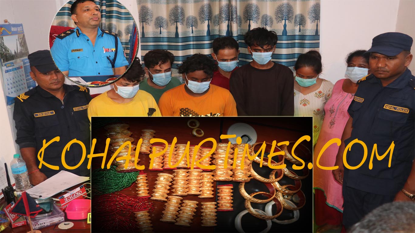इलाका प्रहरी कार्यालय कोहलपुरले नक्कली सुन सहित ७ जना पक्राउ गरेको छ । पक्राऊ पर्नेमा कोहलपुर २ का वर्ष ४२ की निर्मला बोहरा र सोही ठाउ ६ बस्ने बर्ष २३ की मनुराधा बपाल मगर, खजुरा २ बस्ने वर्ष ३८ को तिलक सुनार, जिल्ला अर्घाखाँची घर भई कोहलपुर ११ बस्ने बर्ष ३३ को सन्तोष सुनार, १ बस्ने बर्ष २७ को नवराज विश्वकर्मा, बैजनाथ २ बस्ने बर्ष १९ को दिनेश सुनार र जिल्ला पाल्पा भवुनपईखरी गाउँपालिका ६ बस्ने बर्ष २१ को बाबुराम सुनार रहेका छन ।