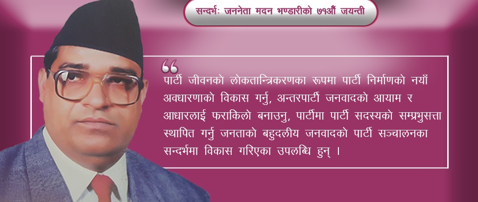 यी सबै विषयको मार्गदर्शक सिद्धान्त विकासमा नेतृत्वदायी भूमिका निर्वाह गर्नुभएका जननेताप्रति श्रद्धा कृतज्ञता व्यक्त गर्नु र उहाँले देखाउनुभएको मार्गचित्र पछ्याउनु परं कर्तव्य हो । जननेता मदन भण्डारीको जन्म वि.स. २००९ साल असार १४ गते पूर्वी नेपालको ताप्लेजुङ जिल्लाको ढुङ्गे साँघुमा भएको थियो । माथि उल्लेख गरिएको नेपाली राजनीतिमा महत्त्वपूर्ण सैद्धान्तिक वैचारिक योगदान गर्नुभएका उहाँको वि.स.२०५० साल जेठ ३ गते चितवनको दास ढुङ्गामा भएको रहस्यमय जीप दुर्घटनामा परी दुःखद अवसान भएको हो । उहाँको मृत्युको रहस्यको पर्दा उघार्ने र उहाँले प्रतिपादन गरेको सिद्धान्त जनताको बहुदलीय जनवादको मार्गदर्शनमा नेपाली धर्तीमा न्यायपूर्ण राजनीतिक व्यवस्था स्थापना गर्ने जिम्मेवारी पूरा गर्ने दायित्व बाँकी नै छ ।