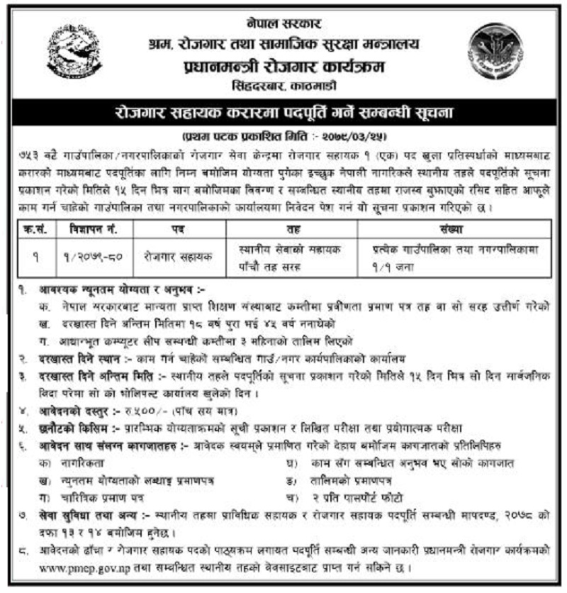 काठमाण्डाै : ७ सय ५३ वटै पालिकाका रोजगार सेवा केन्द्रमा रिक्त रहेको रोजगार सहायक पदमा पदपूर्तिका लागि प्रधानमन्त्री रोजगार कार्यक्रमले दरखास्त आह्वान गरेको छ । हरेक गाउँपालिका र नगरपालिकामा खुला प्रतिस्पर्धाबाट करारमा एक/एक जना रोजगार सहायक पदका लागि विज्ञापन गरिएको हो ।