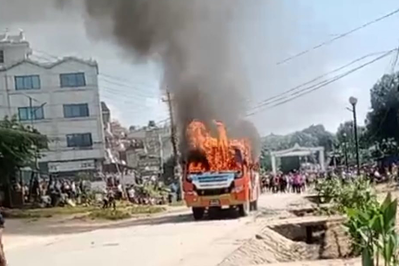 बालकको मृत्यु भएपछि स्थानीय र आफन्तले बसमा आगो लगाइदिएका छन्। उनीहरुले राजमार्ग अवरुद्ध गरेर प्रदर्शन गरिरहेका छन्।