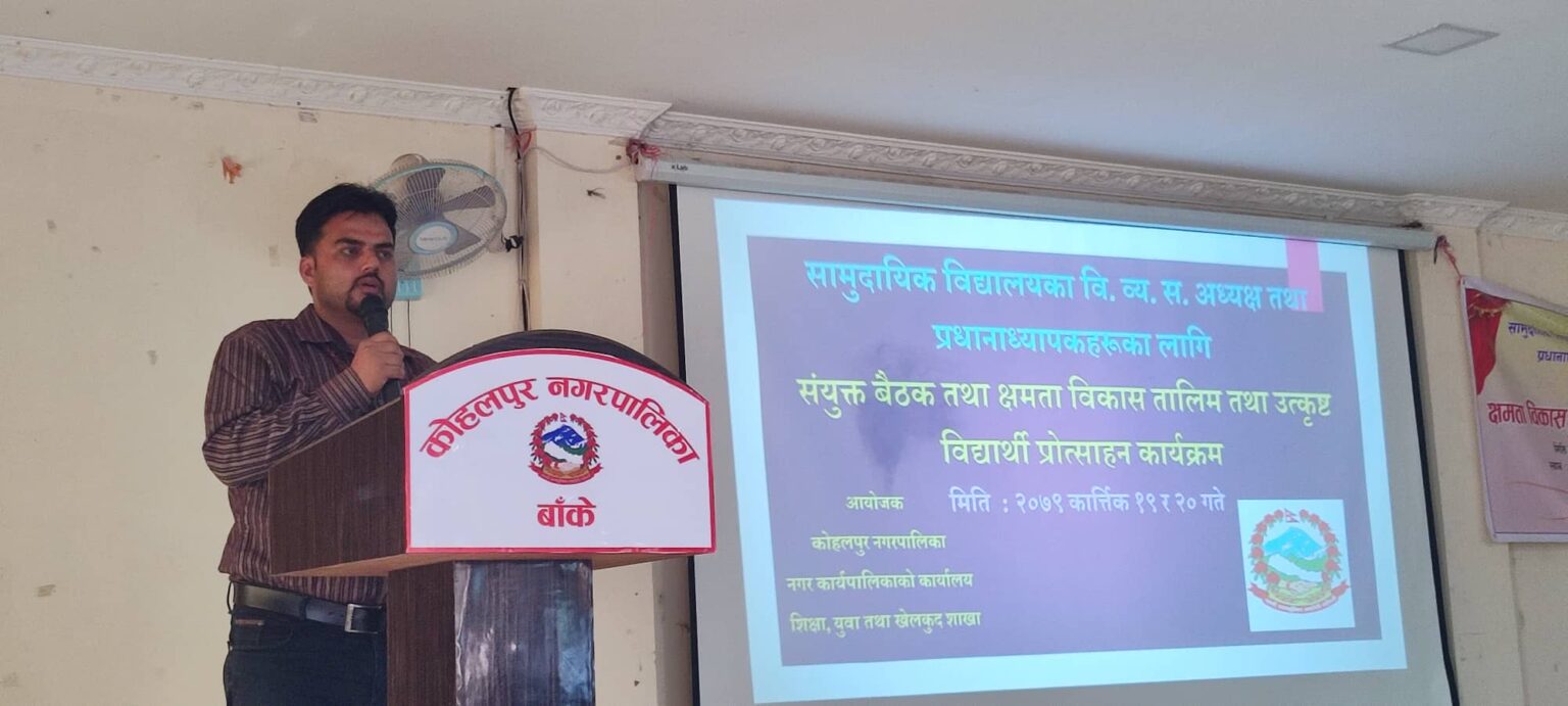 नगर प्रमुख पुर्णप्रसाद आचार्यले शैक्षिक क्षेत्र सुधारका लागि धेरैै प्रयास भइरहेको बताए । कोहलपुरको सामुदायिक तथा संस्थागत विद्यालयको शैक्षिक गुणस्तर सुधारका लागि नरम र गरम दुवै उपाय अवलम्वन गरिने उनले बताए । तालिमको शिक्षाविज्ञ जितबहादुर शाहले सहजिकरण गरेका थिए ।