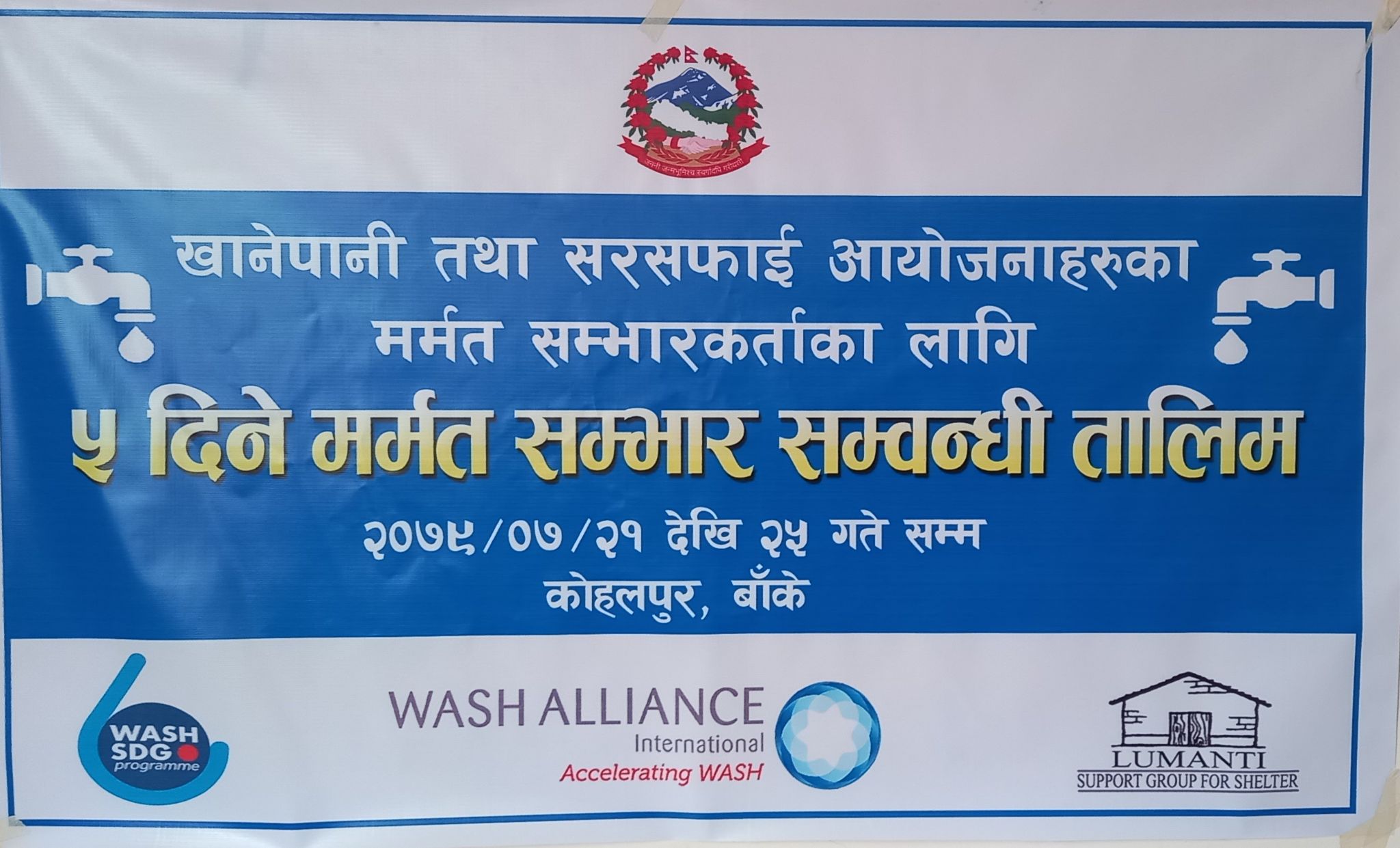 खानेपानी डिभिजन कार्यालय बाकेका प्रमुख तिलक न्यौपानेको प्रमुख आथितयमा तथा कोहलपुर नगरपालिकाका सामजिक बिकास साखा सयोजक ईश्वरी बि.क. को विशेष आथित्यतामा उक्त कार्यक्रम आज सोमबार देखि सुरु भएको हो । कार्यक्रममा कोहलपुर नगरपालिकाका र बैजनाथ गाउपालिकाका १७ खानेपानी आयोजनाका करिब ३० बढि ब्यक्तिहरुको उपस्थिति रहेको थियो ।