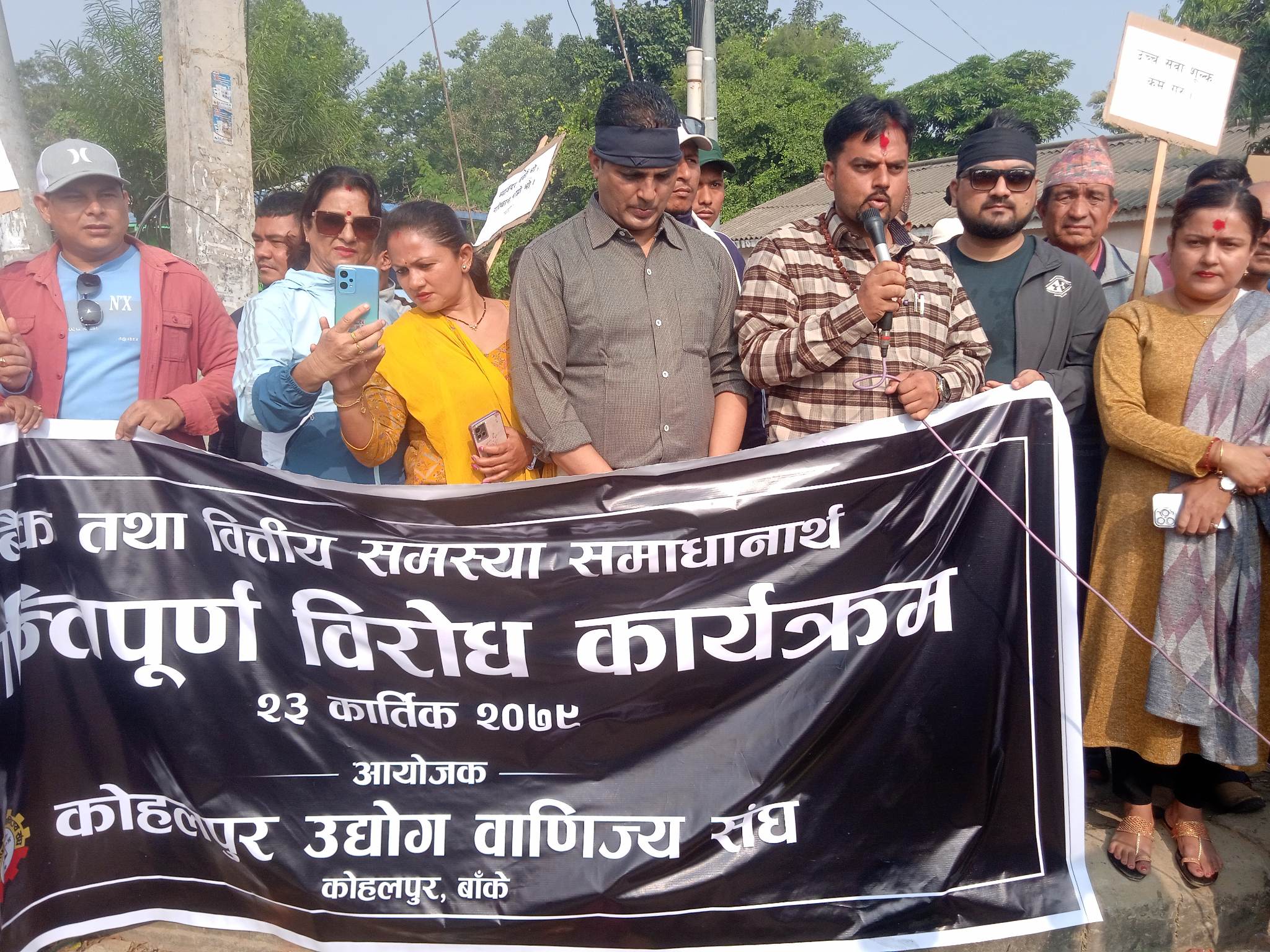 बांके, कोहलपुर: कोहलपुर उद्योग वाणिज्य संघले बैंक तथा वित्तीय संस्थाहरुले अस्वभाविक रुपमा बृद्वि गरेको ब्याजदर र नेपाल राष्ट्र बैंकले जारी गरेको चालु पूजी कर्जा निर्देशिका २०७९ परिमार्जनको माग गर्दै आज बुधवार कोहलपुरमा विरोध प्रदर्शन भएको छ । ”बैंक आतंक बन्द गर”, ”ब्याजदर स्थिर गर”, ”ब्याजदर चको भो गरि खान गाह्रो भो” जस्ता नारा सहितको प्ले कार्ड बोकेर कोहलपुरको न्युरोडबाट निकालिएको उद्योगि ब्यबसायीहरुको बिरोध र्यालिले बजारका बिभिन्न भाग परिक्रमा गरि पुन न्युरोड चोकमा आएर कोण सभामा परिणत भएको थियो ।
