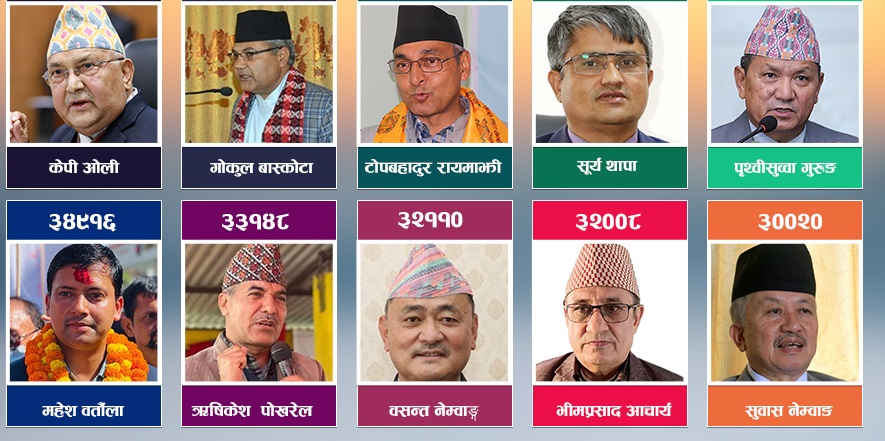लमजुङ १ बाट पृथ्वीसुव्वा गुरुङले ३४ हजार ९६९ मत, मकवानपुर २ बाट महेश कुमार बर्तौला ३४ हजार ९१६ मत, बैतडी १ बाट दामोदर भण्डारी ३३ हजार ६११ मत, धनुषा ३ बाट जुली कुमारी महतो (महासेठ) ३३ हजार ३५५ मत, मोरङ २ बाट ऋषिकेश पोखरेलले ३३ हजार १४८ मत, सर्लाही ३ बाट हरि प्रसाद उप्रेती ३२ हजार ९३८ मत, पाँचथर १ बाट वसन्त कुमार नेम्वाङ्ग ३२ हजार ११० मत, भीमप्रसाद आचार्य, सुनसरी–२ ३२ हजार ८ मत, पाल्पा १ बाट नारायण प्रसाद आचार्य ३१ हजार १०३ मत, धनकुटा १ बाट राजेन्द्र कुमार राईले ३० हजार १०१, सुवासचन्द्र नेम्वाङ इलाम–२ मा (३००२०) मत ल्याएका छन्।
