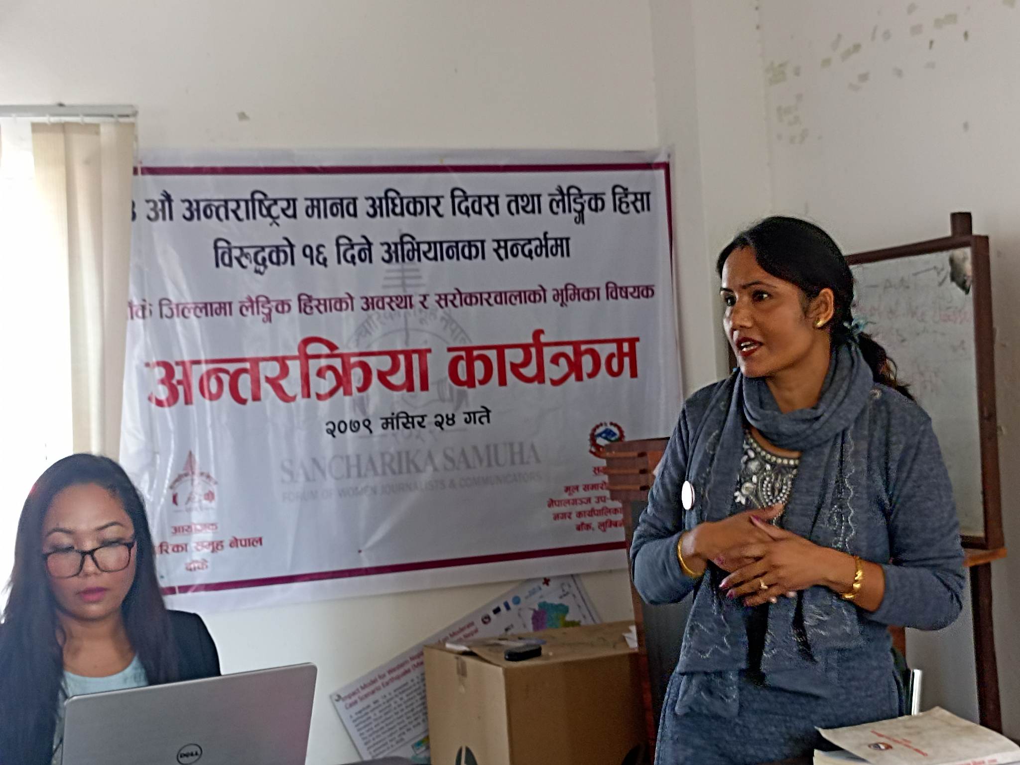 तर यो विषयमा सबैले ध्यान नदिएको पाईएको छ । कानूनका कुुरामा टेकेर र कानूनलाई नै मानेर पिडितका पक्षमा समाचार सम्प्रेषण गर्न आग्रह गरेकी थिइन् । कानूनलाई प्रभावकारी बनाउन सरोकारवालाहरुको आवश्यकता रहेको बताईन् । अनौपचारिक क्षेत्र सेवा केन्द्र इन्सेक सरस्वती मल्ल हामीले महिला हिंसाका या लैंगिक हिंसाका विषयमा बोलि रहेका हुन्छौं तर त्यसले पनि महिलाका पक्षमा वकालत गर्ने र पिडित दुबैलाई हिंसा गराई रहेका हुन्छ । समस्यालाई मात्र उजागर गर्ने नभई समाधान गर्नलाई कार्यान्वयनमा जान आवश्यक रहेको बताईन् । महिलाका विषय महिलाले मात्र उठान गर्नुका साथै पुरुषले पनि उठाउन आग्रह गरेकी थिईन् ।