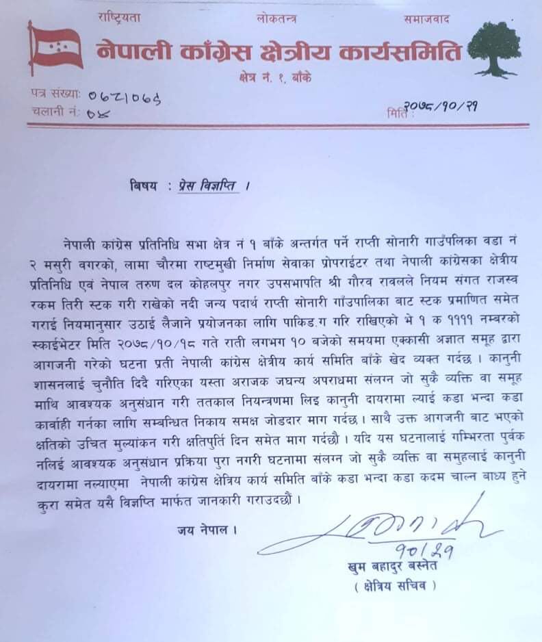 बिज्ञप्तिमा राप्तिसोनारी गाउँपालिका वडा नम्बर २, मसुरी बगरको लामाचौरमा राष्ट्रमुखी निर्माण सेवाका प्रोप्राईटर गौरव रावलले नियम संगत राजस्व रकम तिरी स्टक गरी राखेको नदी जन्य पदार्थ राप्तिसोनारी गाउँपालिकाबाट स्टक प्रमाणित समेत गराई उठाई लैजाने प्रयोजनका लागि पार्किङ गरी राखिएको भे१क ११११ नम्बरको स्काईभेटर गत माघ १८ गते राती लगभग १० बजेको समयमा अज्ञात समुहद्वारा आगजनी गरेको घटनाप्रति नेपाली काँग्रेस बाँके १ नम्बर क्षेत्रीय कार्यसमितिद्वारा खेद व्यक्त गरेको जनाइएको छ ।