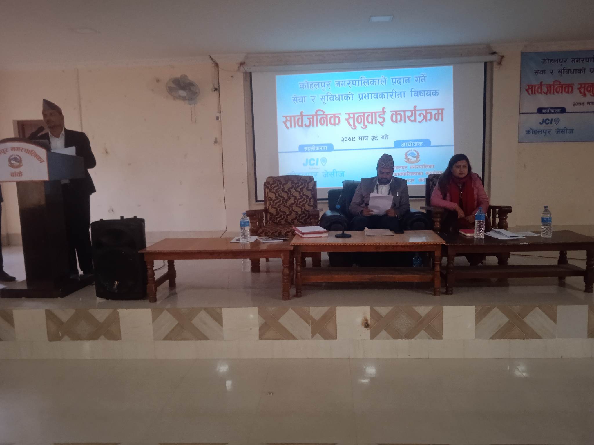 कोहलपुर, बांके: कोहलपुर नगरपालिकाले आर्थिक बर्ष ०७९ /०८० को प्रथम अर्धबार्षिक अबधिमा नगरबाट भए गरेका कामकारबाहिहरुको सार्वजनिक सुनुवाई कार्यक्रम सम्पन्न गरेको छ । जेसीज कोहलपुरको सहजिकरणमा आज आईतवार कोहलपुर नगरपालिका नगर कार्यपालिकाको सभा हलमा कोहलपुर नगरपालिकाले प्रदान गर्ने सेवा र सुबिधाको प्रभावकारीता बिषयक सार्वजनिक सुनुवाई कार्यक्रम सम्पन्न भएको हो ।