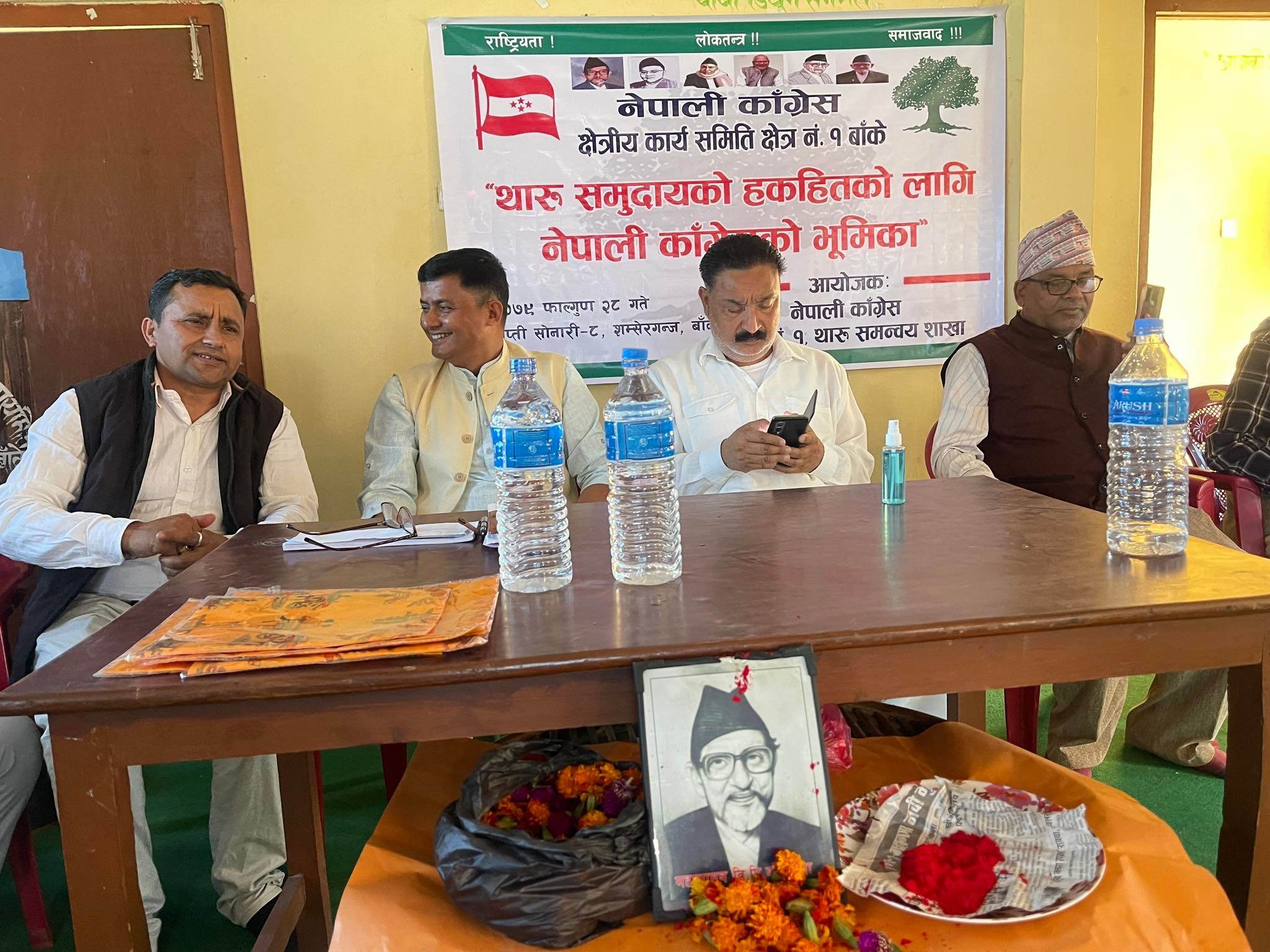 बांके क्षेत्र नं १ का पार्टीका थारू नेता तथा कार्यकर्ताहरूको उत्साहजनक उपस्थिति रहेको अन्तर्कृया कार्यक्रमको पार्टीका सहमहामन्त्री किशोर सिंह राठौरले उदघाटन गर्नुभएको थियो। सो अबसरमा बोल्दै सहमहामन्त्री राठौरले नेपाली कांग्रेसले थारू लगायत सबै आदीवासी जनजातीहरूको हक अधिकारका लागी २०१५ साल देखि नै आवाज उठाउदै आएको बताउनु भयो ।
