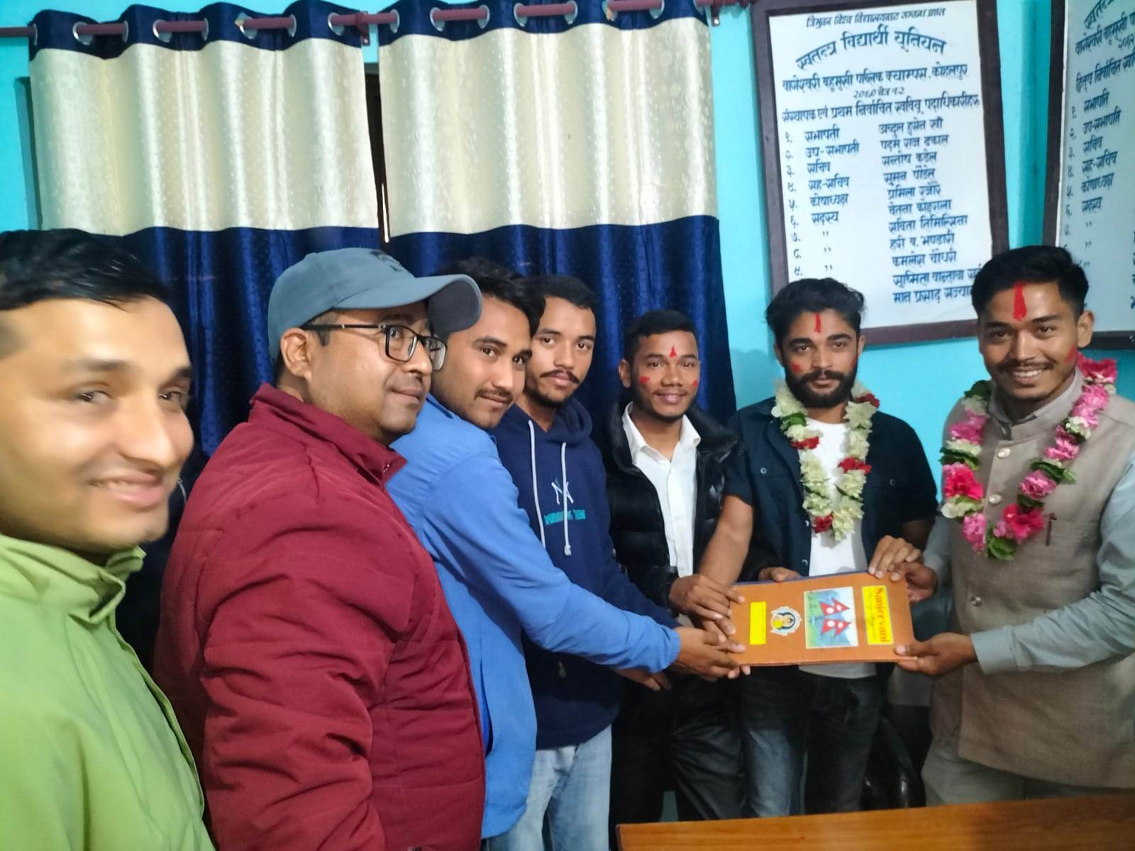 कोहलपुर, बाँके: बाँकेको कोहलपुरमा रहेको बागेश्वरी बहुमुखि क्याम्पसमा सम्पन्न स्ववियु निर्वाचन पश्चात नवनिर्वाचित अध्यक्ष लगाएत पदाधिकारीहरुले शनिबार क्याम्पस परिसरमा पदभार ग्रहण गरेका छन । निर्बतमान स्ववियु अध्यक्ष दिनेश केसिले नवनिवार्चित अध्यक्ष देबेन्द्र बहादुर बुढालाई स्ववियुको माईन्युट बुक हस्तान्तरण गर्दै कार्यभार समेत हस्तान्तरण गरेका हुन । चैत्र ५ गते सम्पन्न स्ववियु चुनावमा यस क्याम्पसमा एमालेको भातृ संगठन अनेरास्ववियुको देबेन्द्र बहादुर बुढाको टिम बिजयी भएको थियो ।