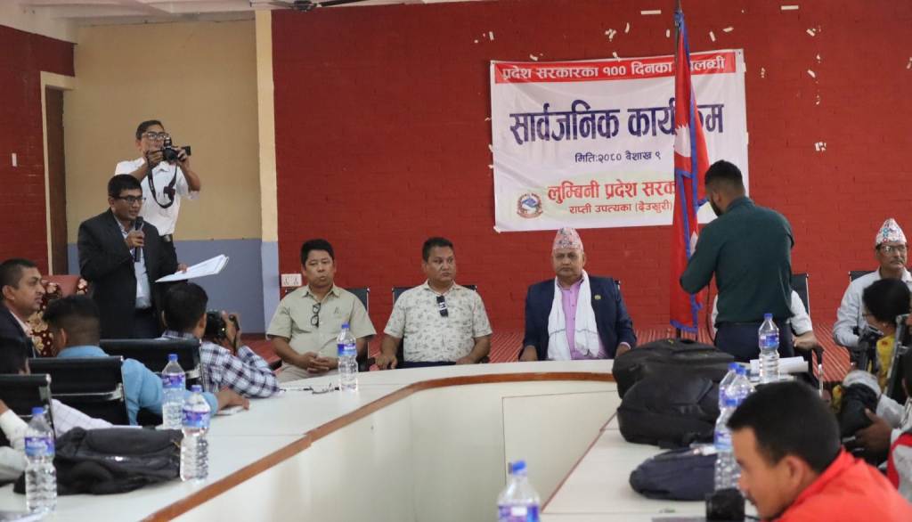 भालुवाङ : लुम्बिनी प्रदेश सरकार गठन भएको सय दिन पूरा गरेको छ। मंसिर ४ गते सम्पन्न निर्वाचनपश्चात् लुम्बिनी प्रदेशको मुख्यमन्त्रीमा लिला गिरी पुस २७ गते नियुक्त भए। ७ राजनीतिक दलको समर्थनमा सरकार गठन भयो। तर, सत्ता साझेदार दल राप्रपाबाहेक अन्य दलले समर्थन फिर्ता लिएपछि सरकार अल्पमतमा परेको छ। वैशाख ११ मा विश्वासको मत लिने तयारी गरेका मुख्यमन्त्री लिला गिरी नेतृत्वको सरकारले सय दिने उपलब्धि सार्वजनिक गरेको छ।