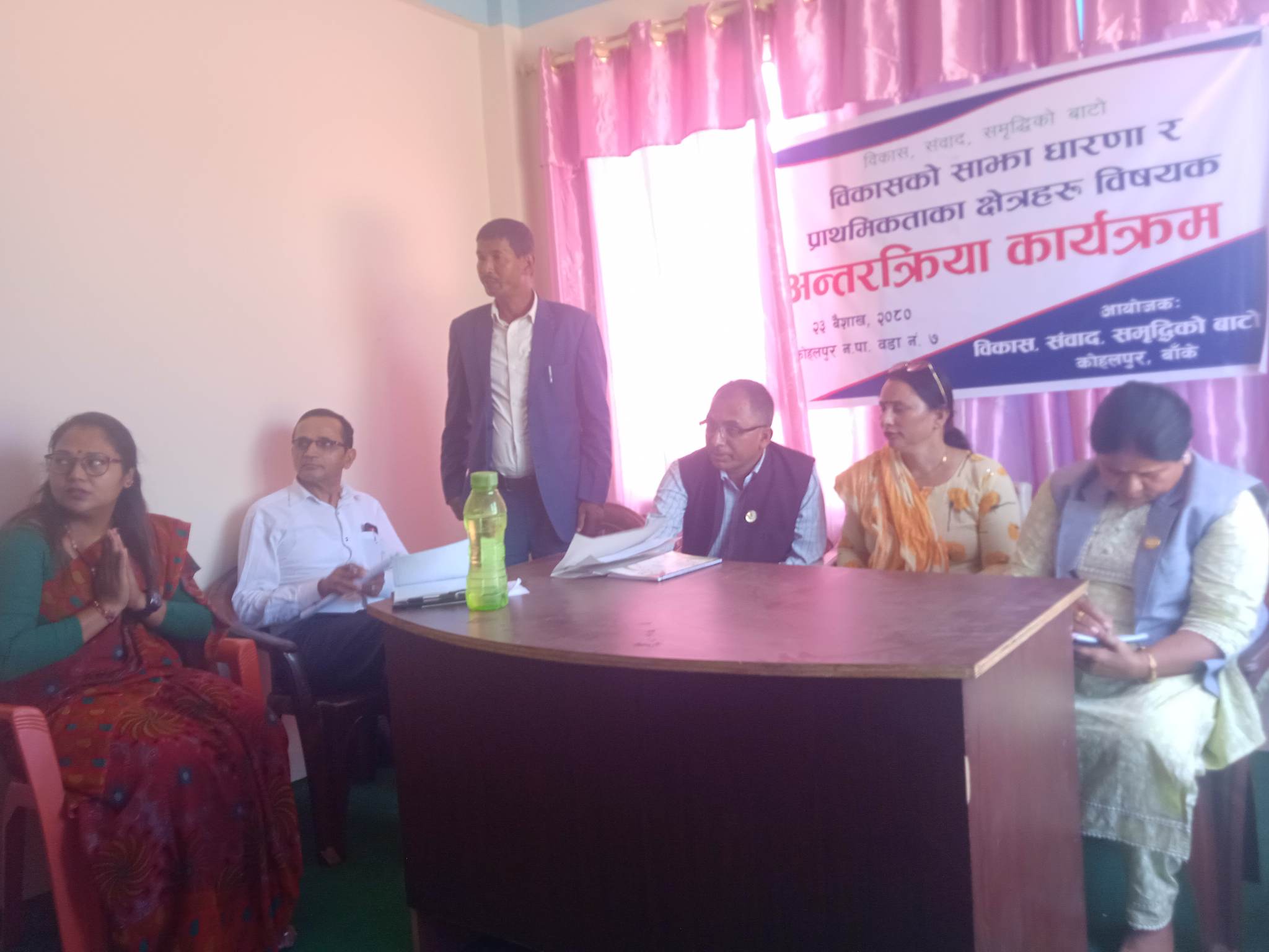 विकास,संवाद, संबृद्धिको बाटो नामक संस्थाका अध्यक्ष माया गौतमको अध्यक्षतामा आयोजित कार्यक्रममा प्रमुख अतिथी एबं संघिय सांसद सुर्य प्रसाद ढकालले बजेट निर्माणको संघारमा उचित ठाउमा उचित कार्यक्रम गरेको भन्दै कार्यक्रममा उठेका आवाजहरुलाई आफुले टिपोट गरेको र कुन तहबाट कसरी सम्बोधन गर्ने भन्ने बिषमा आफुले पहल गर्ने बताए ।