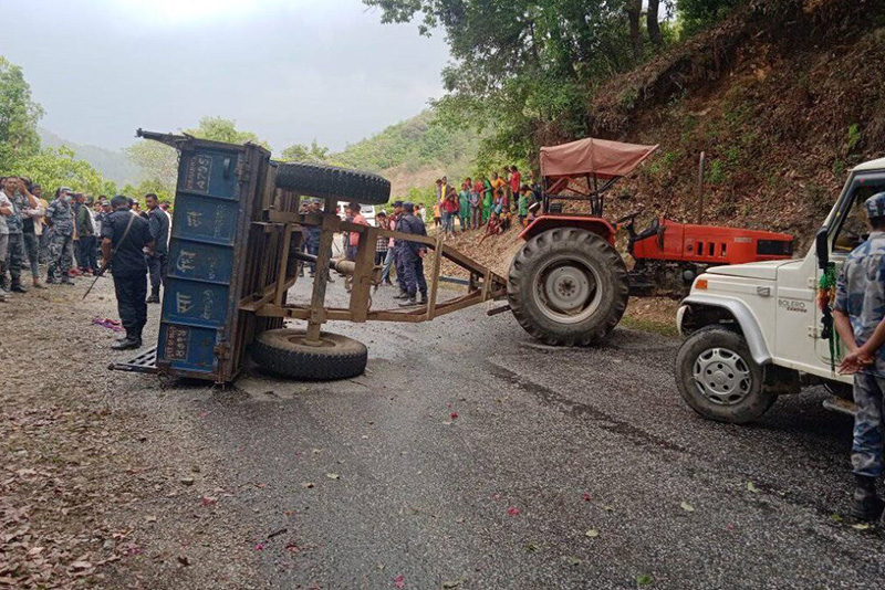 डोटी : डोटीमा ट्याक्टर दुर्घटना हुँदा एक जनाको मृत्यु भएको छ। १९ जना घाइते भएका छन्। भीमदत्त राजमार्ग अन्तरगत जोरायल गाउँपालिका–१ घोरडीस्थित सुपप्र ०१००२ त ६७२३ नम्बरको ट्याक्टर बुधवार साँझ करिब ८ बजेतिर दुर्घटना भएको हो।