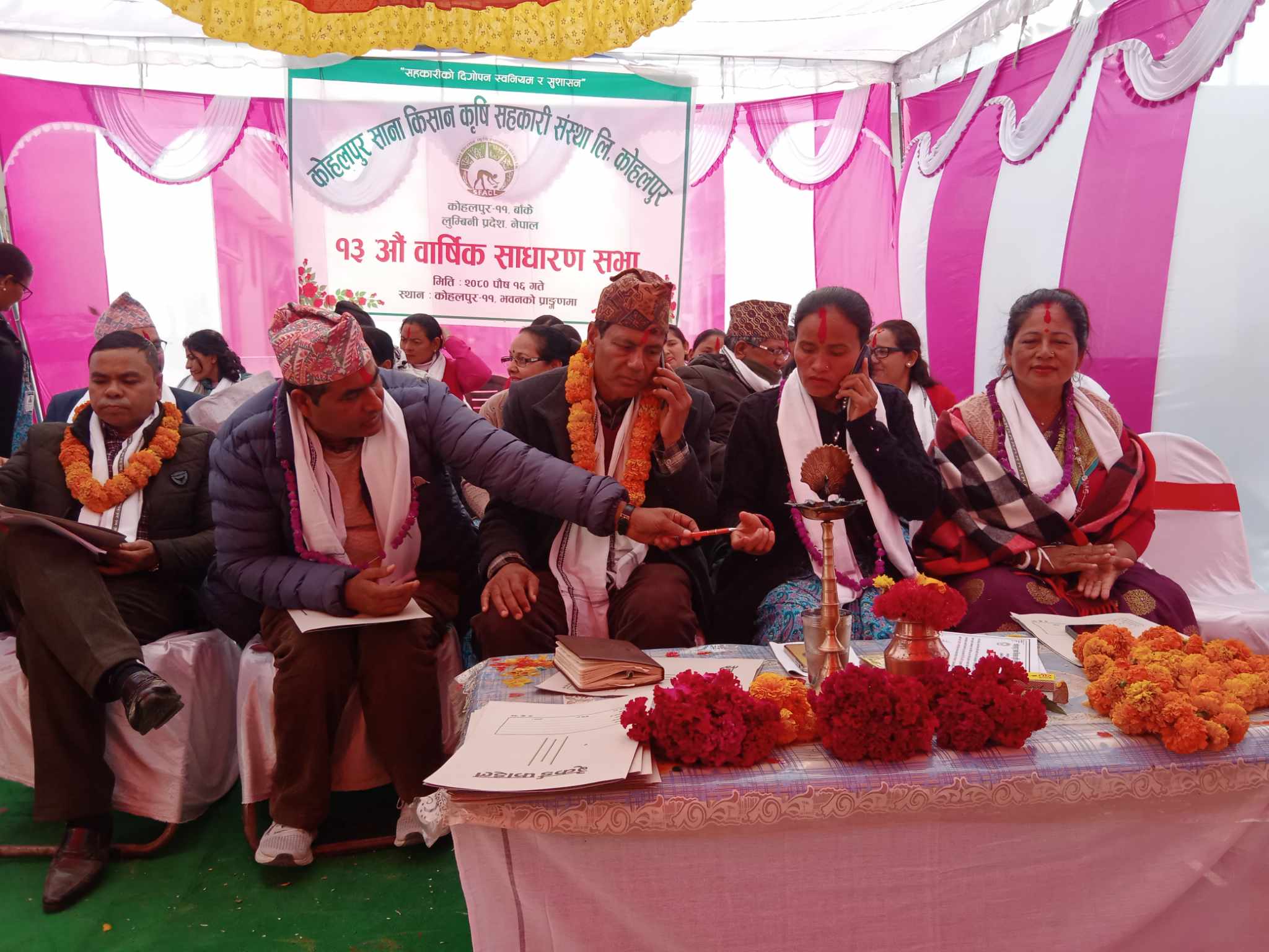 कोहलपुर: बाँकेको कोहलपुरमा रहेको कोहलपुर साना किसान कृषि सहकारी सस्था लिमिटेडको १३ औ बार्षिक साधारण सभा सम्पन्न भएको छ । यस सस्था २०६६ साल बैशाख देखि साना किसान अनुशरण कार्यबाट शुरु भएको हो । साधारण सभाका प्रमुख अथिति नेपाल कृषि सहकारी केन्द्रिय सघका अध्यक्ष खेम बहादुर पाठकले महिलाले नेतृत्व गरेको यो सहकारीलाई ७४ लाख नाफा गर्न सफल भएको हुदा महिलाले नेतृत्व गरेको सस्था कति पारदर्शी छ भन्ने स्पष्ट भएको बताए । नेपाल कृषि सहकारी केन्द्रिय सघका अध्यक्ष पाठकले शेयर सदस्यहरु जहिले पनि चखाखो हुनु पर्ने सहकारीले पैसा मात्र होइन पहिलो प्रथमिकता भनेको ज्ञान र सिप दिन्छ भन्ने कुरालाई बुझनु पर्ने बताएका थिए । यो सहकारी एक सफल र नेपालकै एक नमुना सहकारी भएको आफुले हेर्न चाहेको पाठकले बताए ।