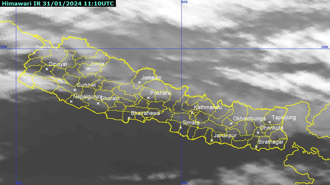 काठमाडौँ — आज दिउँसो देशभर आंशिकदेखि साधारणतया बदली रहने जल तथा मौसम विज्ञान विभागले जनाएको छ । मधेश प्रदेशलगायत देशका पहाडी भू–भागका थोरै स्थानहरूमा मेघ गर्जन/चटयाङसहित हल्का वर्षाको सम्भावना रहेको छ । सुदूरपश्चिम प्रदेश ,कर्णाली प्रदेश र गण्डकी प्रदेशका उच्च पहाडी तथा हिमाली भू–भागका केही स्थानहरूमा हल्कादेखि मध्यम हिमपातको साथै बाँकी उच्च पहाडी तथा हिमाली भू–भागका थोरै स्थानहरूमा हल्का हिमपातको सम्भावना रहेको छ । आज राति देशभर आंशिकदेखि साधारणतया बदली रहनेछ ।