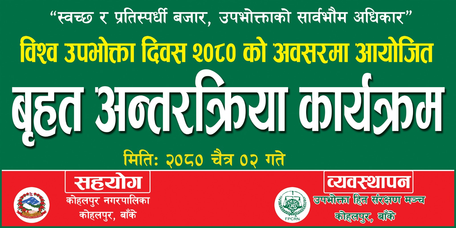 बाँकेको कोहलपुरमा कोहलपुर नगरपालिकाको सहयोगमा बिश्व उपभोग्ता हित दिवसको अबसरमा अन्र्तक्रिया कार्यक्रमको तयारी तिब्रताका साथ भइरहेको उपभोग्ता हित संरक्षण मन्च कोहलपुरका उपाध्यक्ष बैकुन्ठ प्रसाद अधिकारीले बताए ।