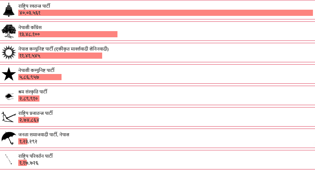 निर्वाचन आयोगको पछिल्लो विवरणअनुसार रास्वपाले ३९ लाख ५० हजार ८१०, कांग्रेसले १३ लाख ३० हजार १०१, नेपाली कम्युनिस्ट पार्टीले ५ लाख ७९ हजार ६२६ मत पाएको छ । श्रम संस्कृति पार्टीको २ लाख ८७ हजार ६४५ मत प्राप्त गरेको छ ।