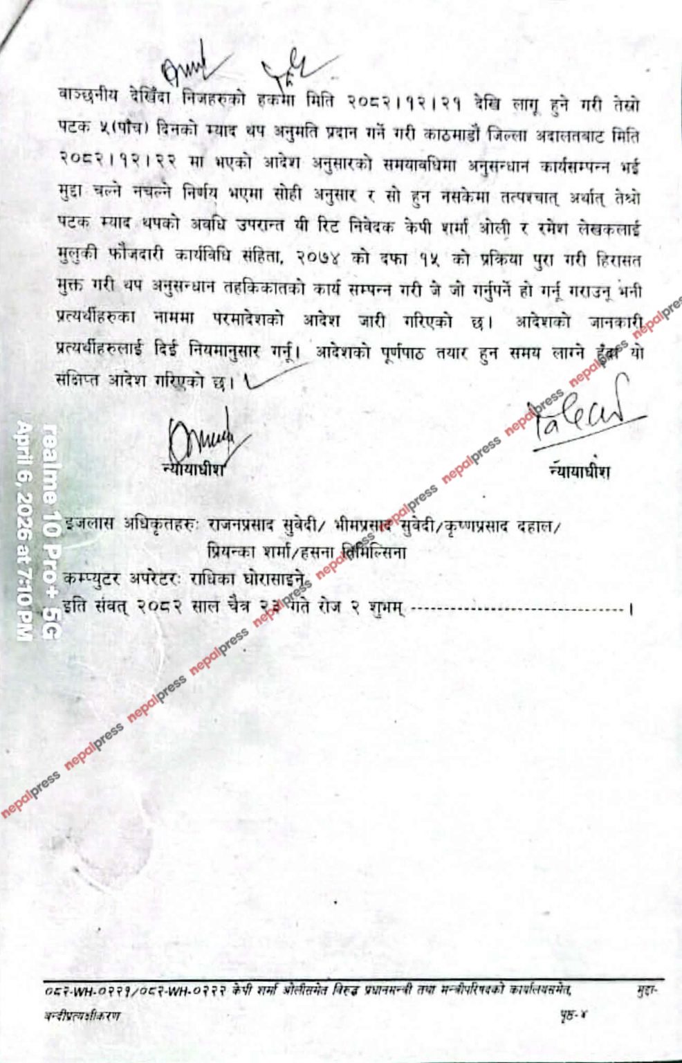 ओली–लेखकको बन्दी प्रत्यक्षीकरण रिट खारेज, अब म्याद नथप्न परमादेश