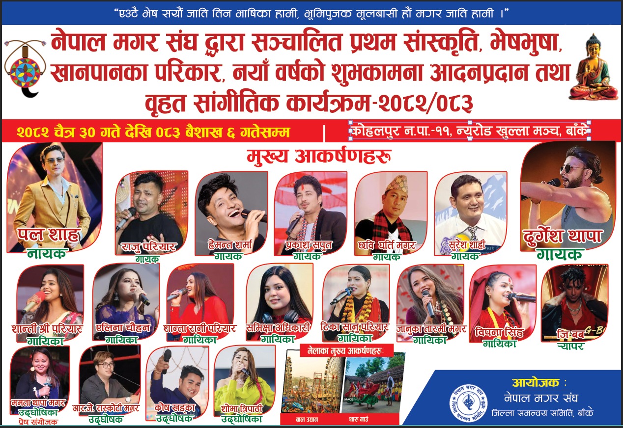 नेपाल मगर संघ जिल्ला समन्वय समिति बाँकेको आयोजनामा “प्रथम सांस्कृतिक, भेषभूषा, खानपानका परिकार तथा नयाँ वर्ष २०८३ को शुभकामना आदान-प्रदान एवं वृहत सांगीतिक कार्यक्रम- २०८२/०८३” आयोजना भएको छ। मगर समुदायको मौलिक पहिचान झल्काउने यस महोत्सवले स्थानीय संस्कृति संरक्षण र प्रवर्द्धनमा महत्वपूर्ण योगदान पुर्‍याउने अपेक्षा गरिएको छ।