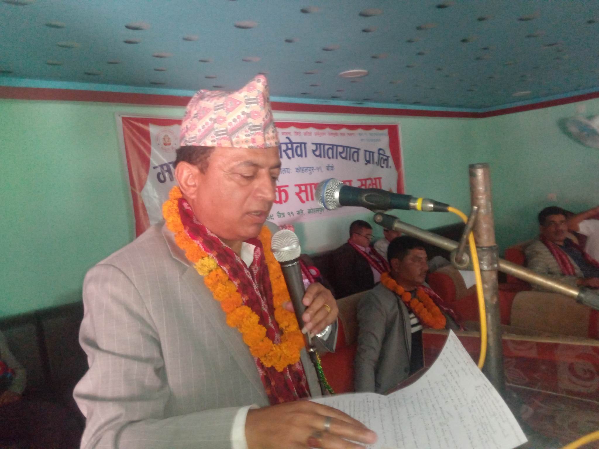 आज शनिबार कोहलपुरमा आयोजित मध्यपश्चिम जनसेवा यातायात प्रालि पांचौ बार्षिक साधारण सभालाई सम्बोधन गर्दै अध्यक्ष खनालले यस्तो बताएका हुन । उनले यातायात क्षेत्रलाई ब्यबस्थित र सुरक्षित राख्न चुनौती रहेकै बेला सरकारका बिभिन्न अपुरा नितिका कारण ब्यबसायीहरु प्रताडित रहने वातावरण सिर्जना भएको बताए ।