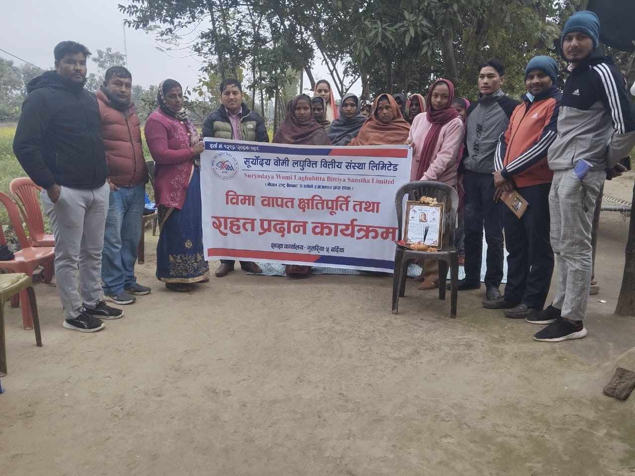 गुलरिया,बर्दिया: सुर्योदय वोमि लघुवित्त वित्तीय संस्थाको गुलरिया शाखाले एक कार्यक्रमको आयोजना गरि आफना ग्राहक सदस्यलाई राहत रकम हस्तान्तरण गरेको छ। गुलरिया नगरपालिका वार्ड नं. ४ स्थित टपरी गाउमा गठित कोटही महिला समुहकी सदस्य स्व.लज्जावती गोडियाको २०८० कार्तिक२८गते असामायिक निधन भएकोमा संस्थाले बिमा सुबिधा अन्तरगत सदस्य सुरक्षण बाफतको रकम रु.३ लाख २५ हजार बरावरको चेक गुलरिया नगरपालिका वार्ड न. ४ का वाड अध्यक्ष सुरेश गौतमले मृतकका श्रीमान सुरेश गोडियालाई हस्तान्तरण गरेका हुन।