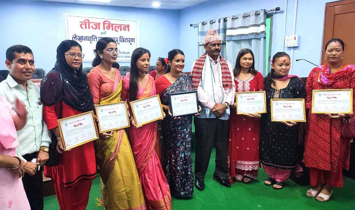 बाँके : नेपाल प्रेस युनियन बाँकेले आयोजना गरेको तीज लेखनबृति प्रतियोगितामा रेडियो नेपाल बाँके जिल्ला सम्बाददाता पत्रकार सरला सुवेदी प्रथम हुनुभएको छ। प्रतियोगितामा सहभागी भएका सात जना महिला पत्रकारमध्ये सुवेदीको लेख उत्कृष्ट ठहरिएको हो। प्रतियोगितामा साबित्री बिश्वकर्मा दोस्रो र आरती कट्टेल तेस्रो स्थानमा पर्नुभएको छ। उत्कृष्ट भएसँगै उहाँहरुलाई क्रमशः पाँच हजार, तीन हजार, र दुई हजार रुपैयाँले पुरस्कृत गरिएको छ। लेखनबृति प्रतियोगितामा बाँकेका सात जना महिला पत्रकारले सहभागिता जनाएका थिए, जसमा बिमला चौधरी, ममता थापा, शिवानी विक, र शाहिदा बानो पनि थिए। प्रतियोगितामा सहभागी सबैलाई नगद एक/एक हजार रुपैयाँका दरले पुरस्कृत गरिएको थियो। लुम्बिनी प्रदेशका वन तथा वातावरण मन्त्री बादशाह कुर्मीले प्रमाणपत्र र नगद पुरस्कार वितरण गर्नुभएको थियो।
