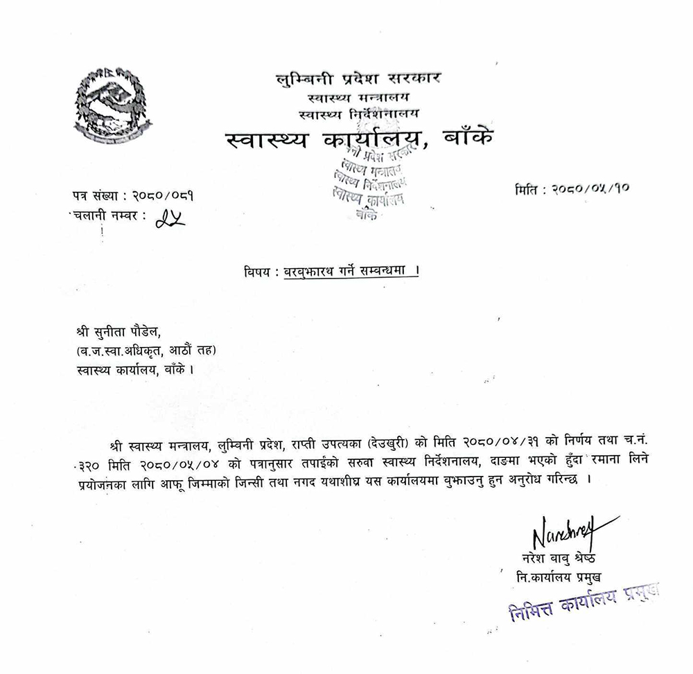 स्वास्थ्य कार्यालय बाँकेका निमित्त प्रमुखले आफनो क्षेत्राधिकार बाहिर गएर सरुवाको पत्र लेखेपछि…….